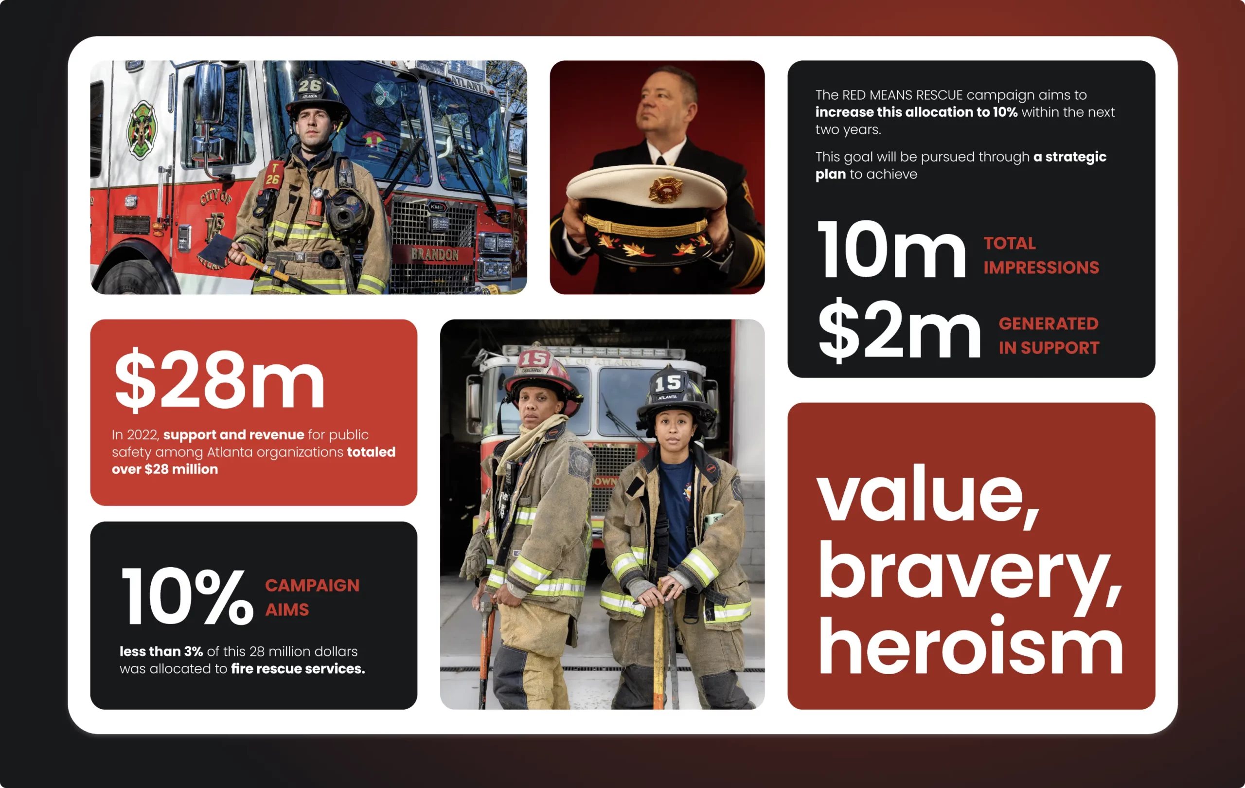 Even though Atlanta organisations invested $28 million in revenue for public safety organisations, only 3% of that revenue was allocated to fire rescue services. To better support the vital services that support the community on multiple levels, that allocation has to increase to at least 10% of the total accumulated revenue.